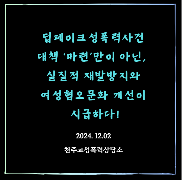 지난 4개월 간 피해자들이 용기를 내 신고한 결과로, 딥페이크성폭력 사건들과 그를 둘러싼 우리 사회의 여성을 대상화하고 혐오하는 통념을 드러내는 놀이문화의 탈을 쓴 폭력들이 많이 알려지게 되었다. 단순히 이슈화에 그치지 않고, 피해자들의 권리 회복을 위한 지속적 지원과 연대가 필요하다. 정부의 미흡한 대책 속에서 시민들은 염증을 느끼면서도, 지난 9월 피해자들을 지지하고 가해자들이 책임을 지도록 감시하며, 성평등 사회로 나아가기 위해 끝까지 함께할 것을 다짐했었다.