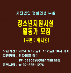 사단법인 평화의샘 부설 청소년지원시설 활동가 모집(구분 : 취사원)