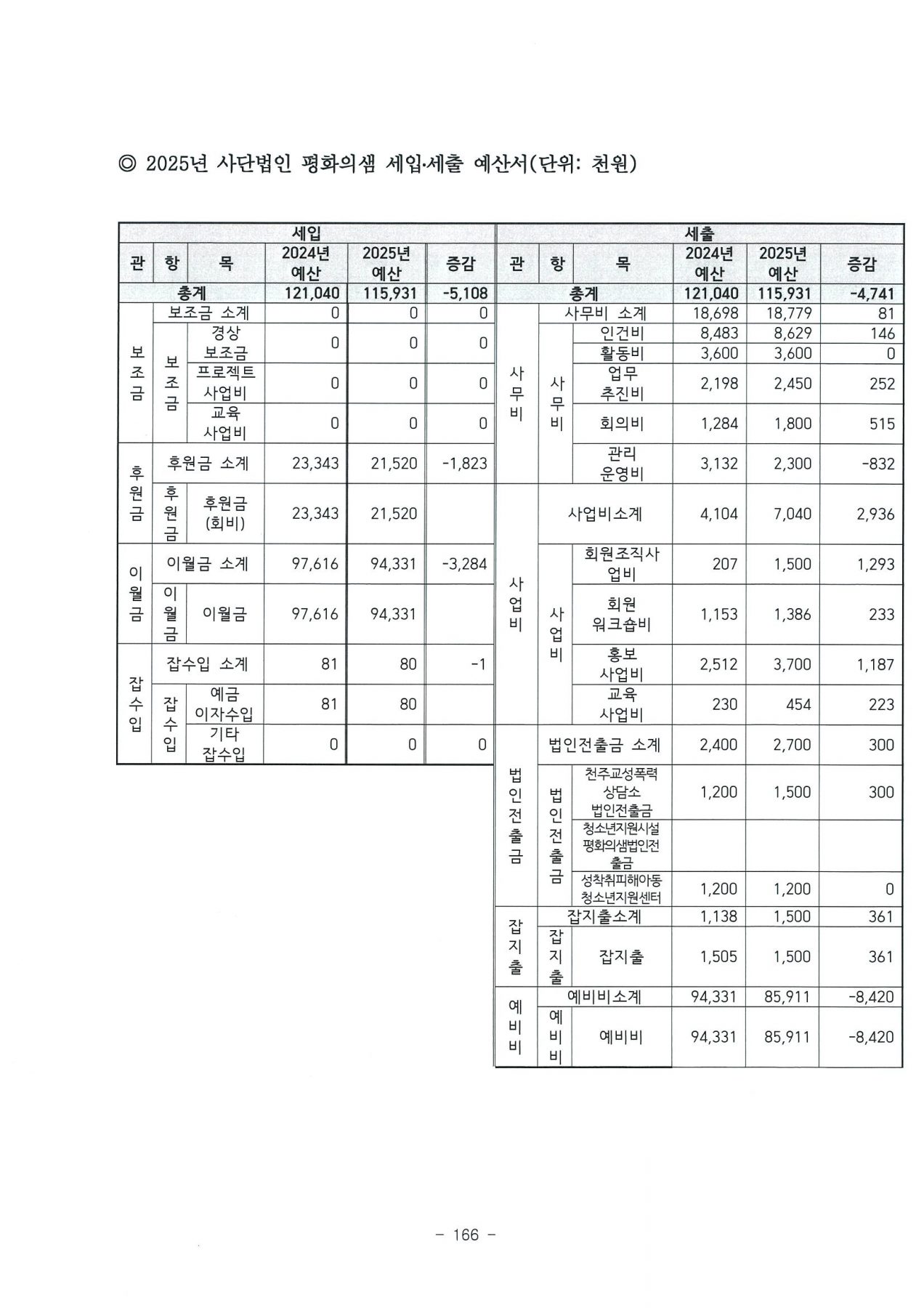 사단법인 평화의샘 2024년 결산서 및 2025년 예산서 게시