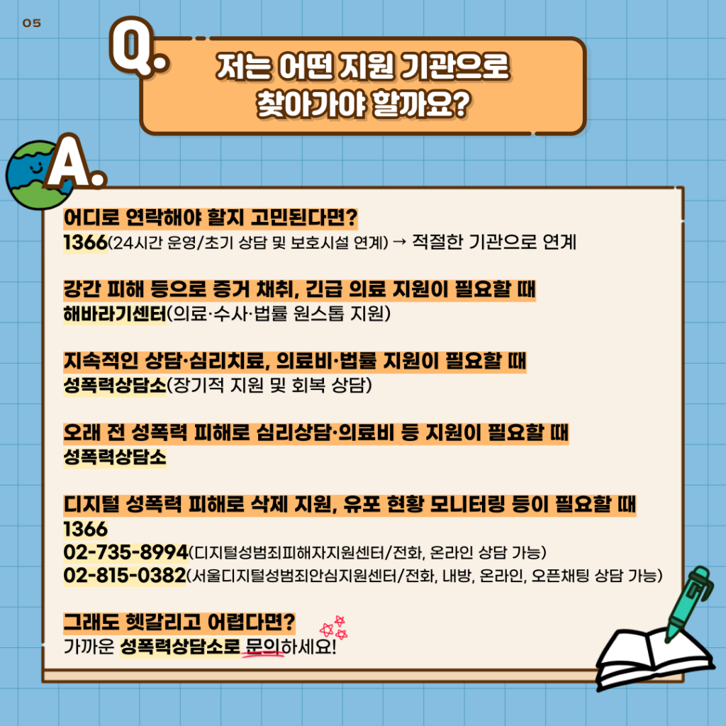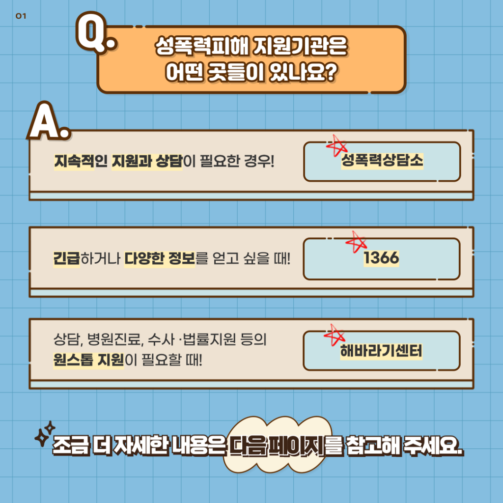 Q. 성폭력피해 지원기관은 어떤 곳들이 있나요?