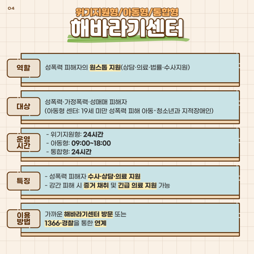 👉 해바라기센터 (의료·수사·법률 원스톱 지원)