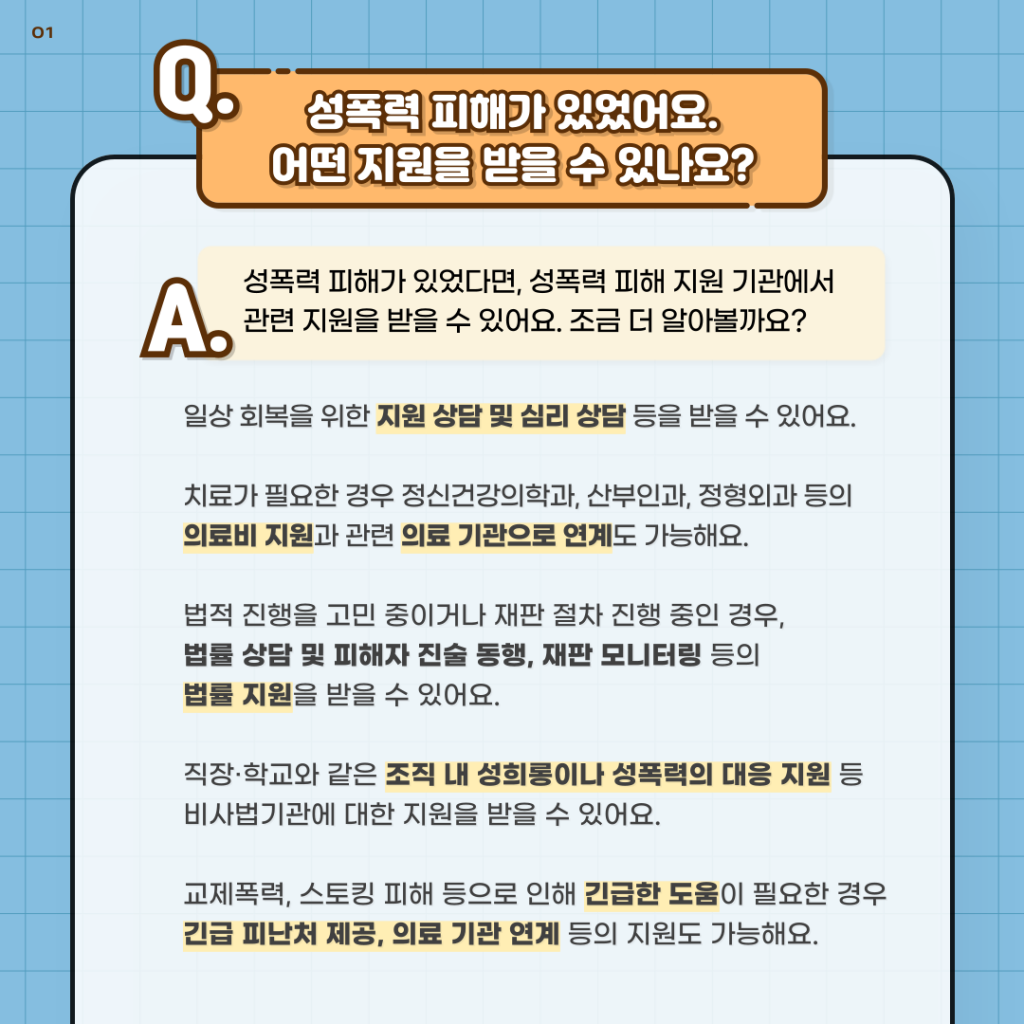 Q. 성폭력 피해가 있었어요. 어떤 지원을 받을 수 있나요?