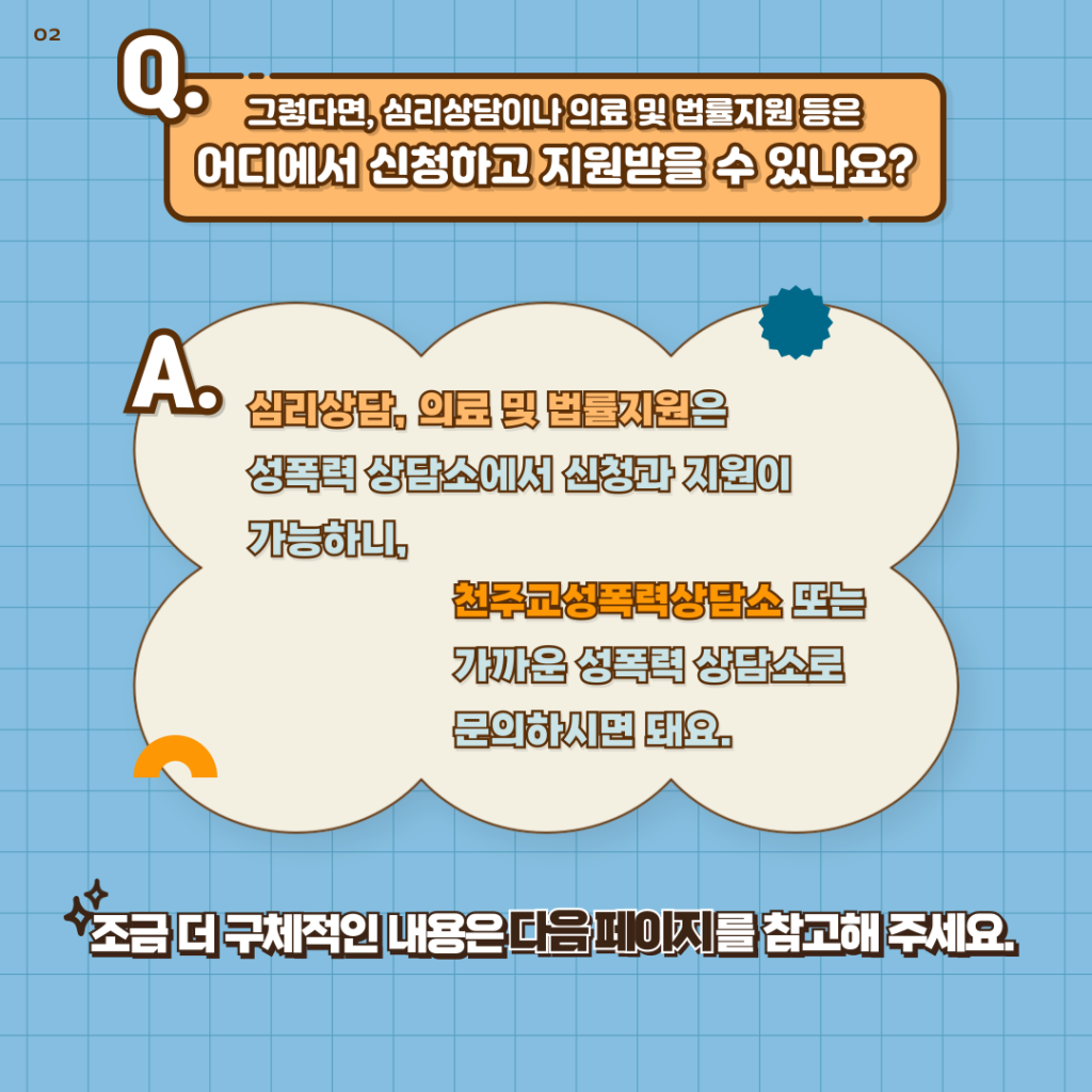 A. 심리상담, 의료 및 법률지원은 성폭력 상담소에서 신청과 지원이 가능하니, 천주교성폭력상담소 또는 가까운 성폭력 상담소로 문의하시면 돼요.
