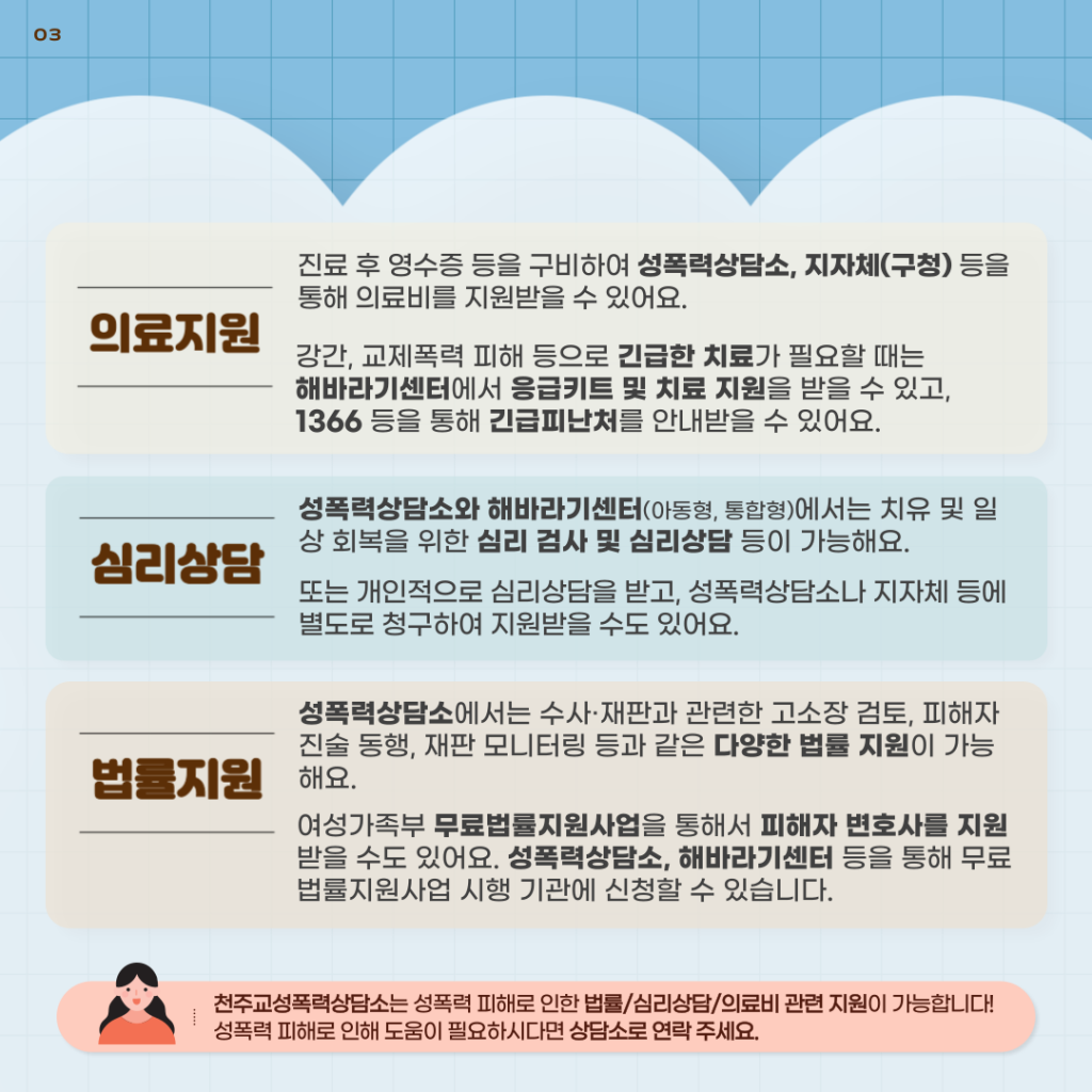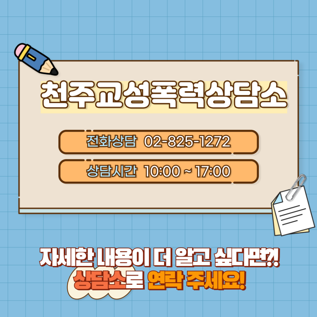 📌 천주교성폭력상담소는 성폭력 피해로 인한 법률/심리상담/의료비 관련 지원이 가능하니