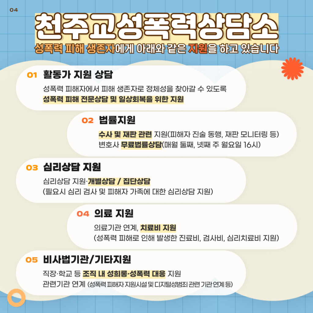 ✅ 저희 천주교성폭력상담소는 성폭력 피해 생존자에게 다음과 같은 지원을 하고 있습니다.