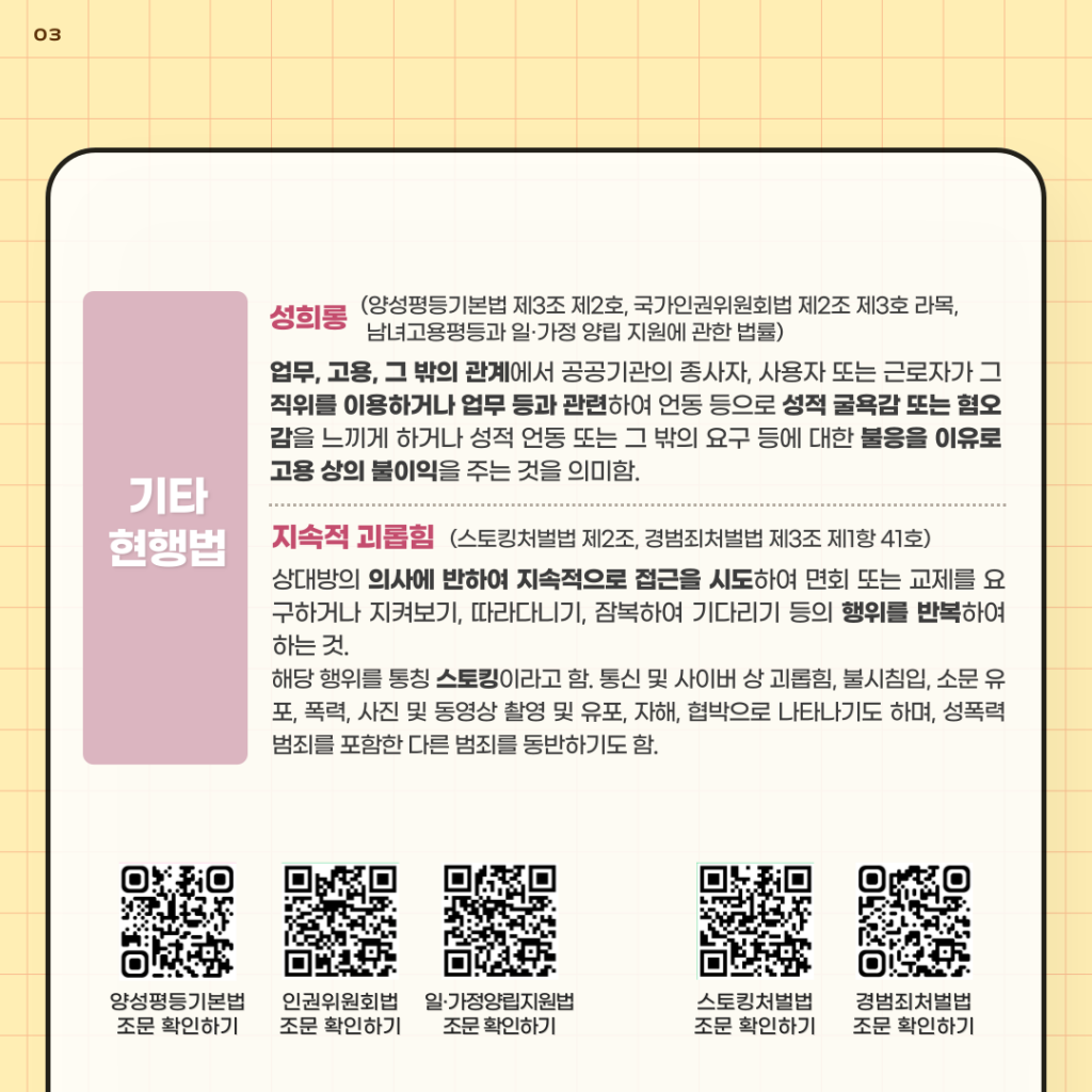 ✅ 성희롱(양성평등기본법 제3조 제2호, 국가인권위원회법 제2조 제3호 라목, 남녀고용평등과 일·가정 양립 지원에 관한 법률)