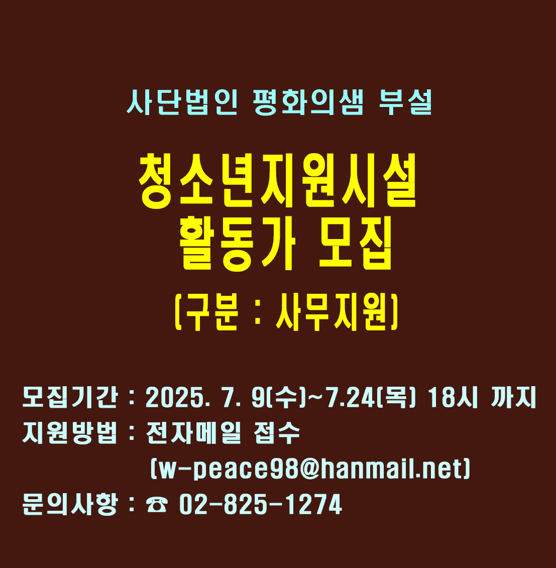 청소년지원시설 평화의샘 활동가 모집(직종: 사무지원_숙직근무 가능한 자)