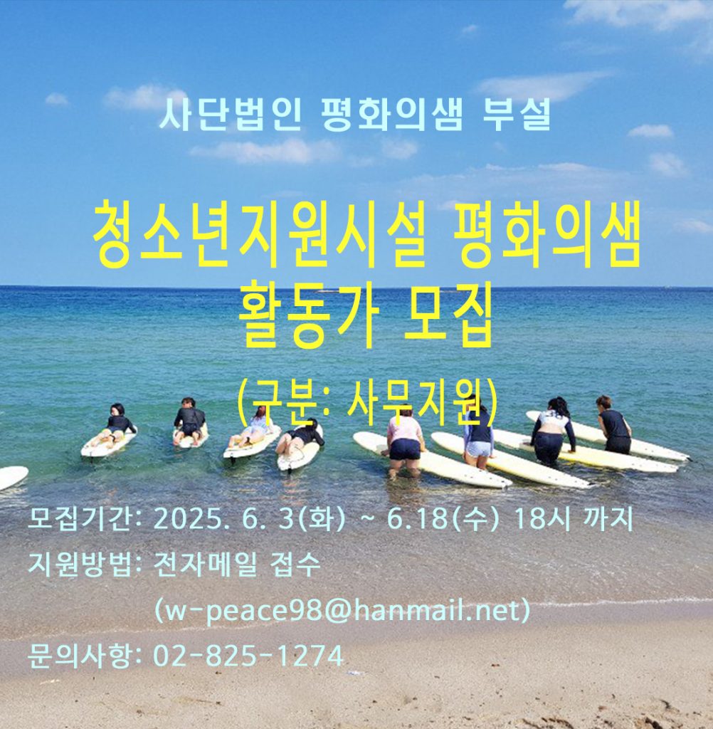 청소년 지원시설 평화의샘 활동가 모집(직종: 사무지원_숙직근무 가능한 자)