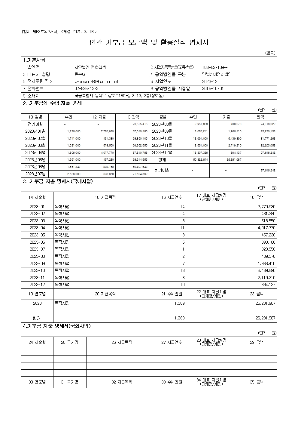 2023년 사단법인 평화의샘 연간 기부금 모금액 및 활용실적 명세서 게시