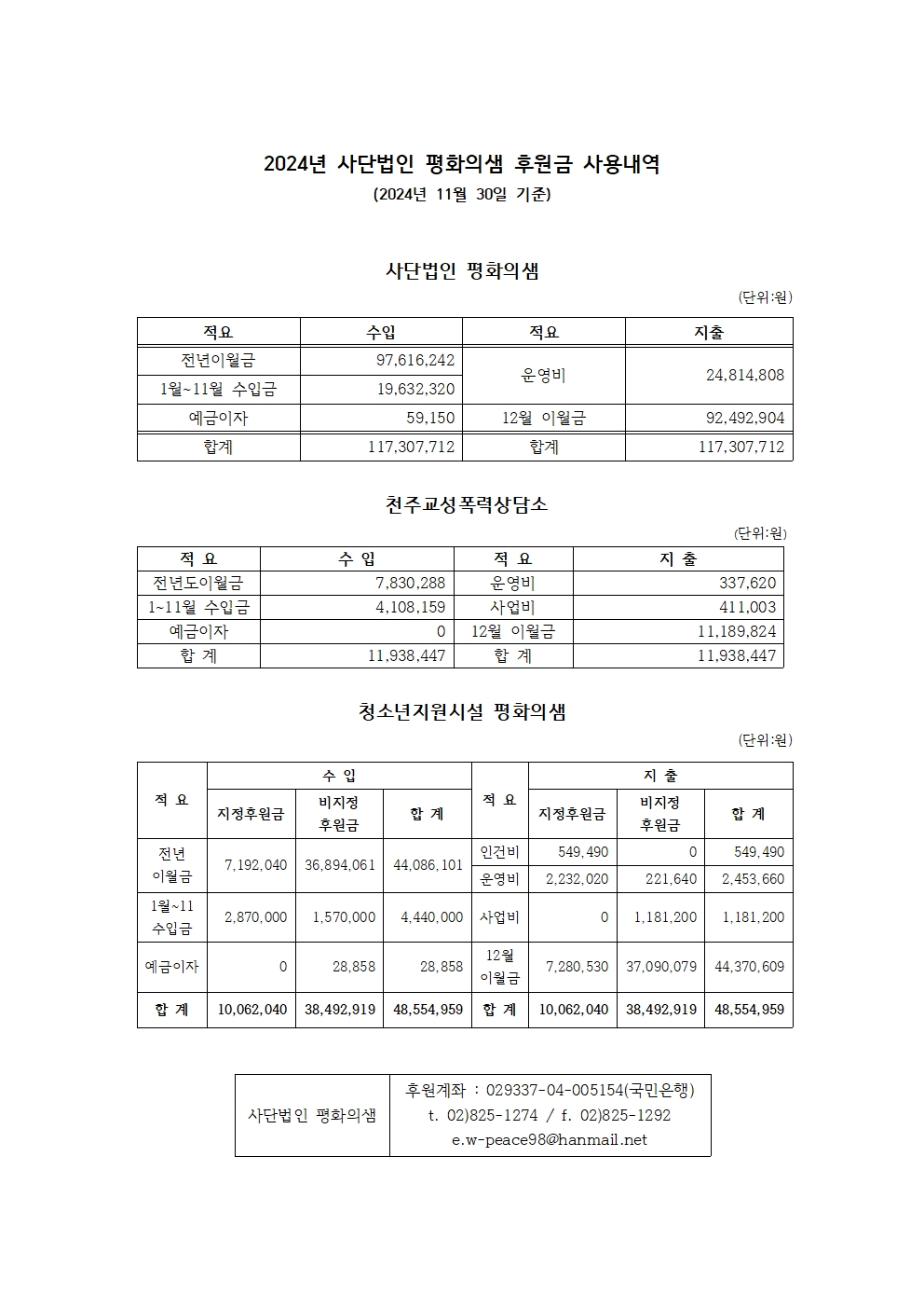 2024년 1월~11월 사단법인 평화의샘 , 천주교성폭력상담소, 청소년 지원시설 평화의샘 후원금 사용 내역