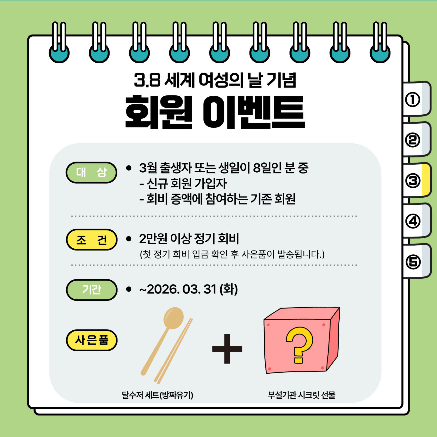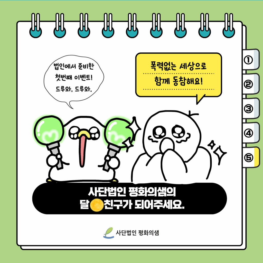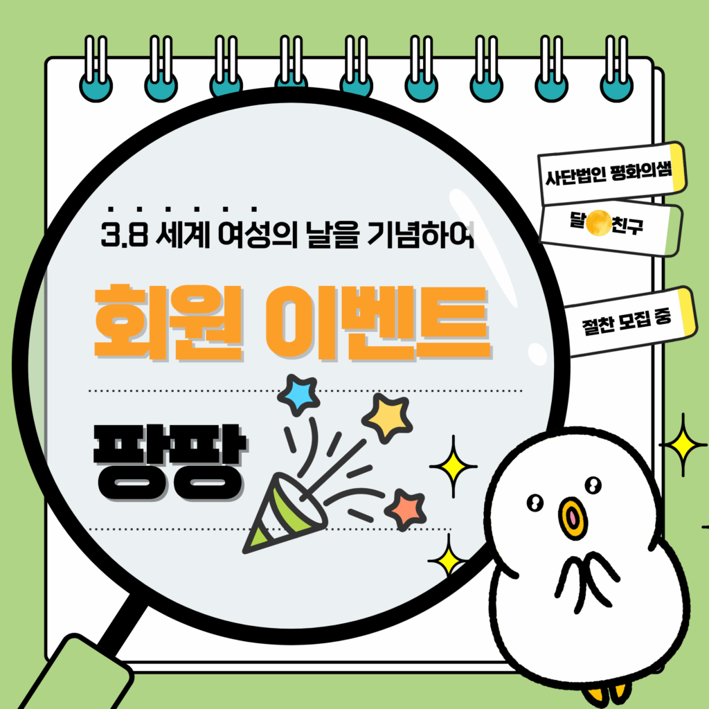 3.8 세계여성의 날을 기념하여 회원 이벤트를 진행합니다. (~3/31일까지) 안녕하세요, 사단법인 평화의샘입니다. 3월 8일 세계 여성의 날을 기념하여 회원 이벤트를 진행합니다. 이벤트는 오늘부터 3월 31일까지 진행되니 많은 관심과 참여 부탁드립니다. 법인에서 준비한 이벤트가 궁금하시다면 아래 소식지를 참고해주세요! ♥ 사단법인평화의샘2026년 03월 06일공지사항태그3.8여성대회사단법인 평화의샘세계여성의날이벤트