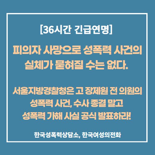 🔥[36시간 긴급 연명]🔥 피의자 사망으로 성폭력 사건의 실체가 묻혀질 수는 없다. 서울지방경찰청은 고 장제원 전 의원의 성폭력 사건, 수사 종결 말고 성폭력 가해 사실 공식 발표하라!