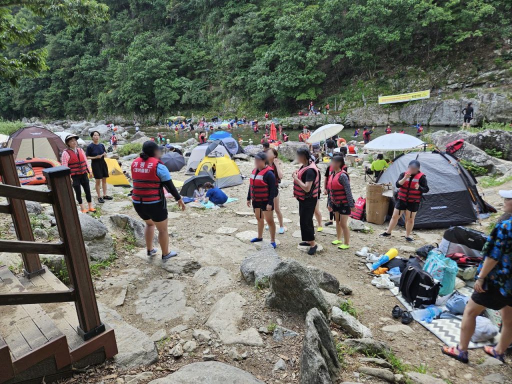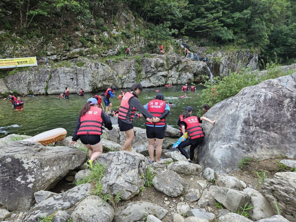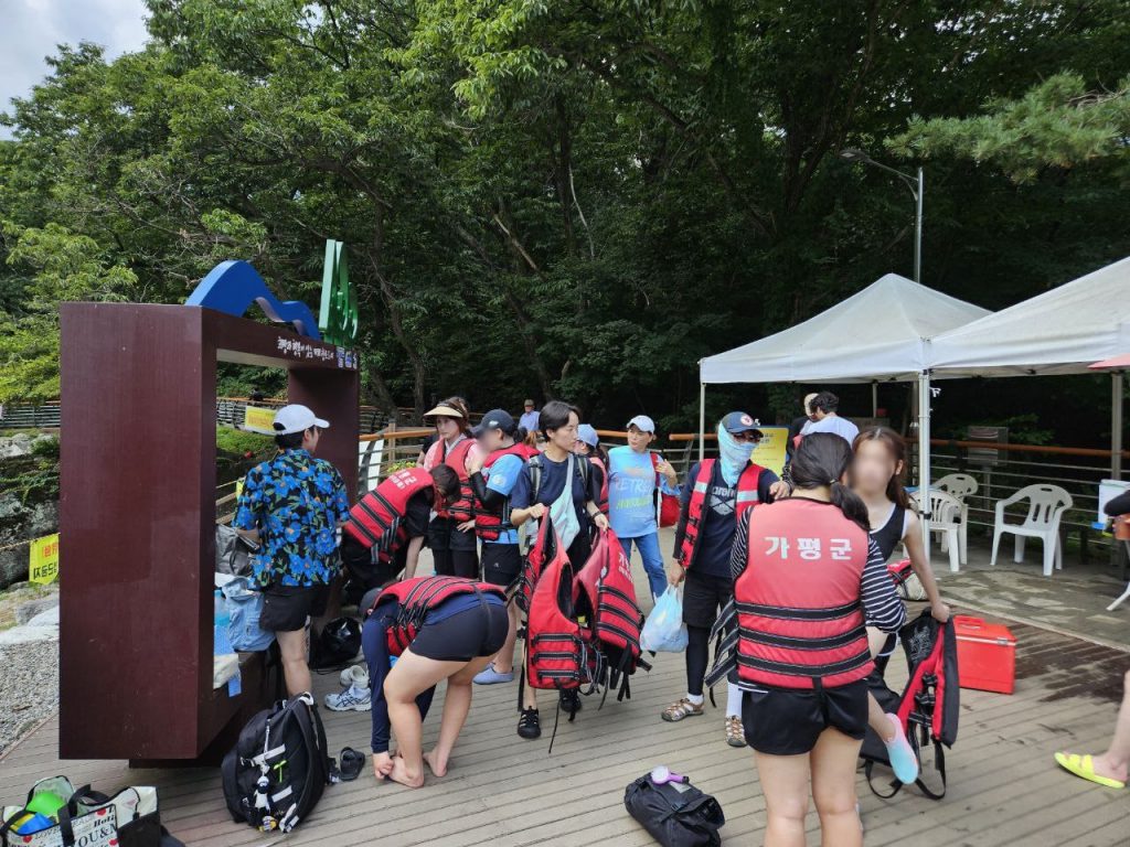 계곡은 중간중간 깊은 곳도 있어서 구명조끼는 필수입니다. 모두 꼼꼼하게 구명조끼를 챙겨입고