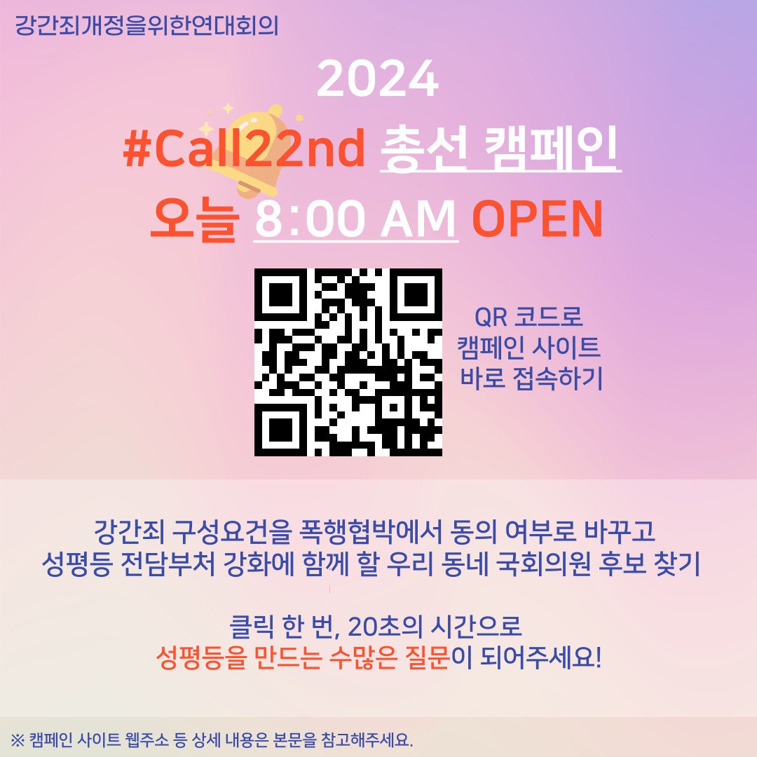#call22nd 총선 캠페인 ‘강간죄 구성요건’을 폭행협박에서 ‘동의 여부’로 바꾸고 성평등 전담부처 강화에 함께할 우리 동네 국회의원 후보 찾기